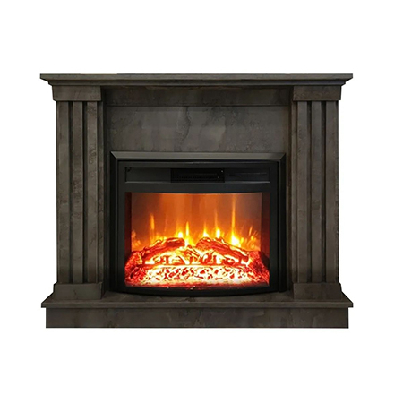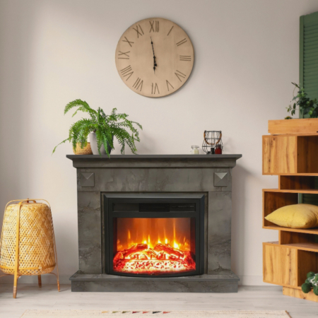 A modern and industrial-style electric fireplace featuring an MDF outer