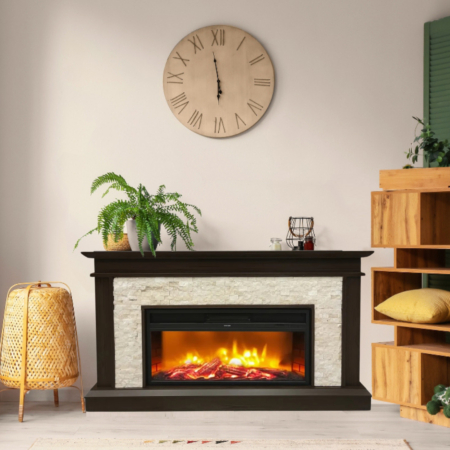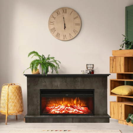 A modern and industrial-style electric fireplace featuring an MDF exterior
