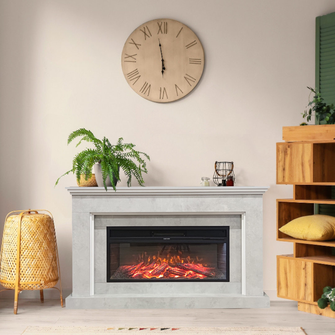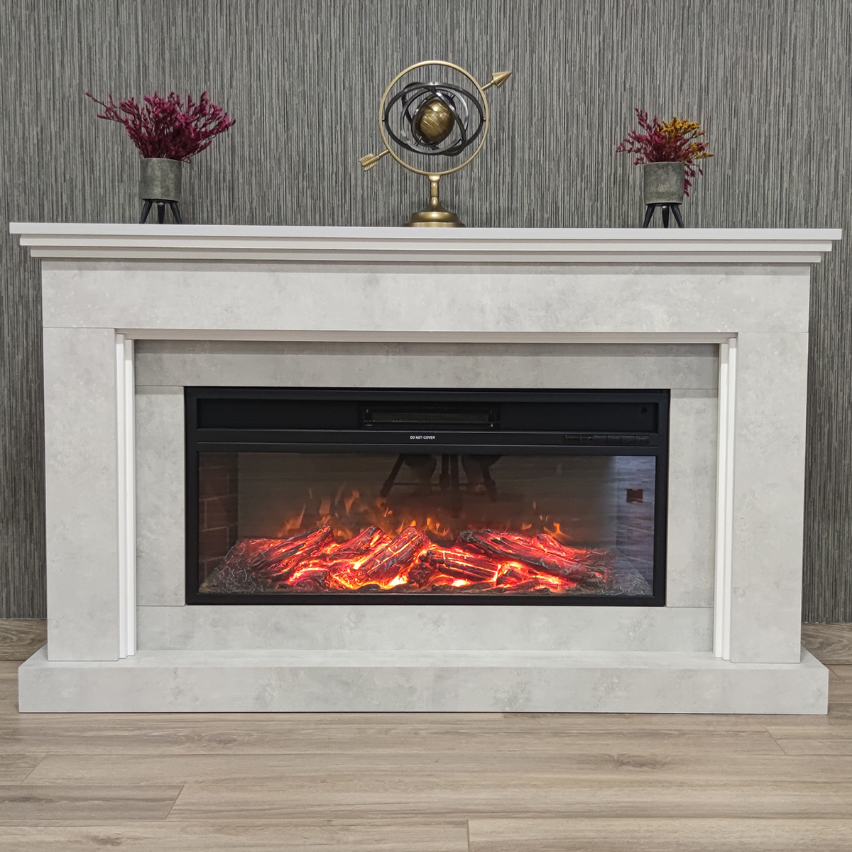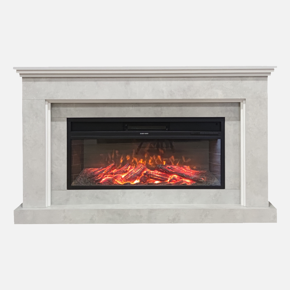 A modern and industrial-style electric fireplace featuring an MDF exterior with a gray concrete pattern, offering a sleek and contemporary aesthetic. It includes remote control operation, an adjustable LED flame effect, and a two-stage heating system (900W/1800W) for customizable warmth. The thermostatic system and timer function provide energy-efficient temperature control. With dimensions of 139.5 cm (width) x 83.5 cm (height) x 34.5 cm (depth) and a weight of 47 KG, this fireplace is a stylish and functional addition to modern interiors.